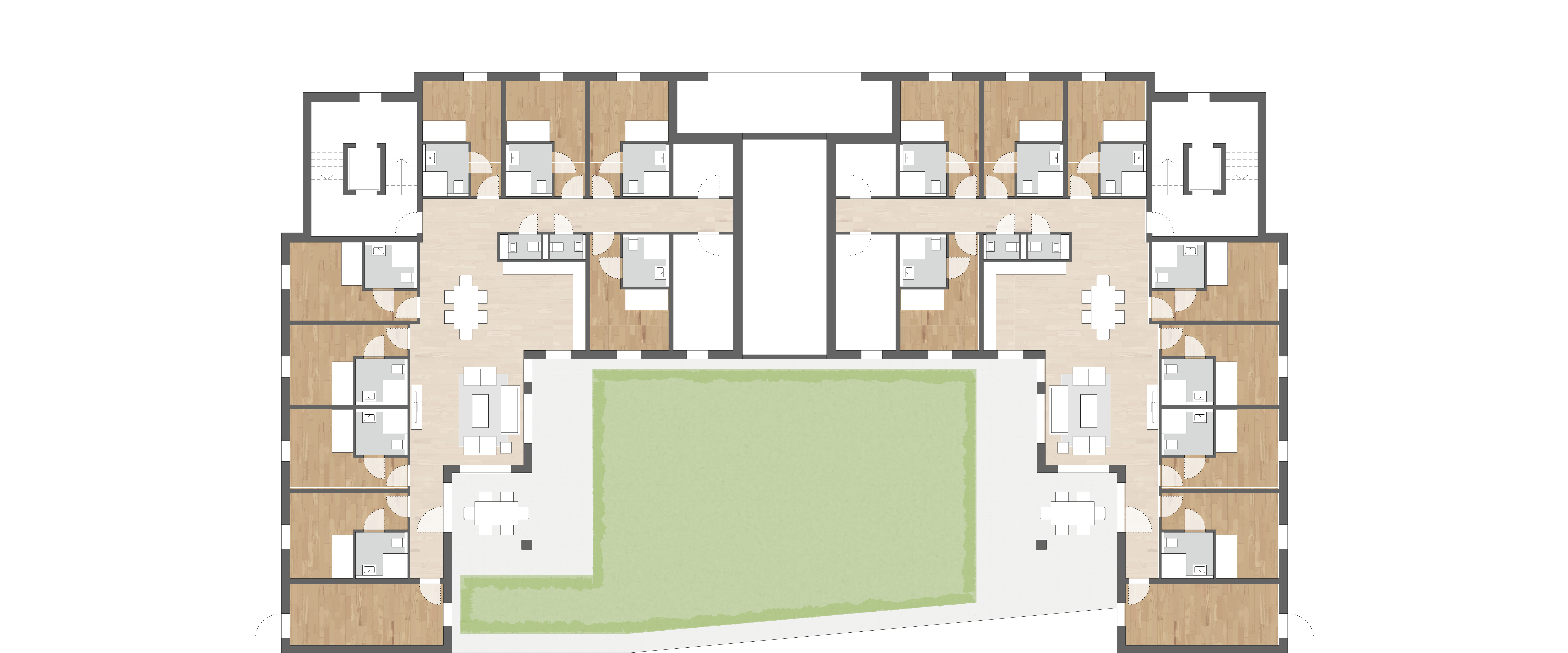 Jede Wohngruppe besteht in der Regel aus 7 bis 12 Personen – groß genug für Austausch und geselliges Miteinander, aber klein genug, um eine ruhige, persönliche Atmosphäre zu bewahren. Während sich die Bewohner bei Bedarf in ihre privaten Räume zurückziehen können, laden großzügige Gemeinschaftsbereiche und offene Küchen dazu ein, den Tag gemeinsam zu gestalten – ob bei einer Tasse Kaffee, beim Kochen oder bei kleinen Aktivitäten im Alltag.