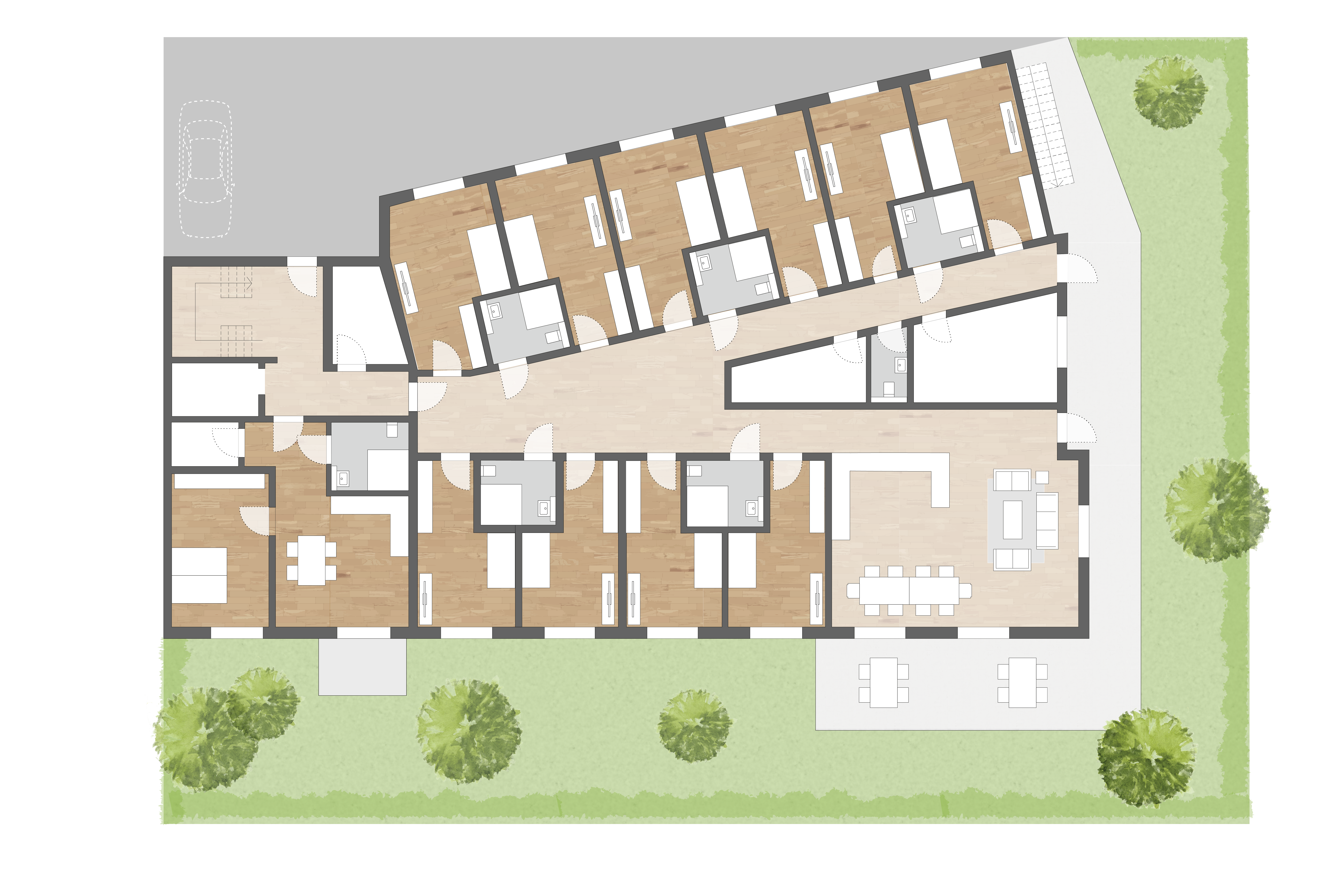 Die Wohnräume sind wohnlich, hell und individuell eingerichtet – fernab von institutioneller Atmosphäre. Jeder Bewohner hat sein eigenes Zimmer als privaten Rückzugsort, während großzügige Gemeinschaftsbereiche wie Küche, Wohnzimmer, barrierefreie Bäder sowie Gärten oder Terrassen zum gemeinsamen Leben einladen. Die übersichtliche und offene Gestaltung der Räume erleichtert die Orientierung und schafft ein Gefühl von Geborgenheit.